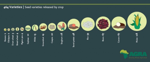 • Publicly-funded crop breeding programs supported by AGRA since 2007 have released 464 new varieties of 15 important crop species developed for specific African climates and soils. Many breeders employed at a national level work collaboratively with international breeders from the CGIAR Consortium who provide breeding stock and, sometimes, finished varieties. Through public-private partnerships with seed companies, more than 300 of these new varieties already are available to farmers via local seed companies.
