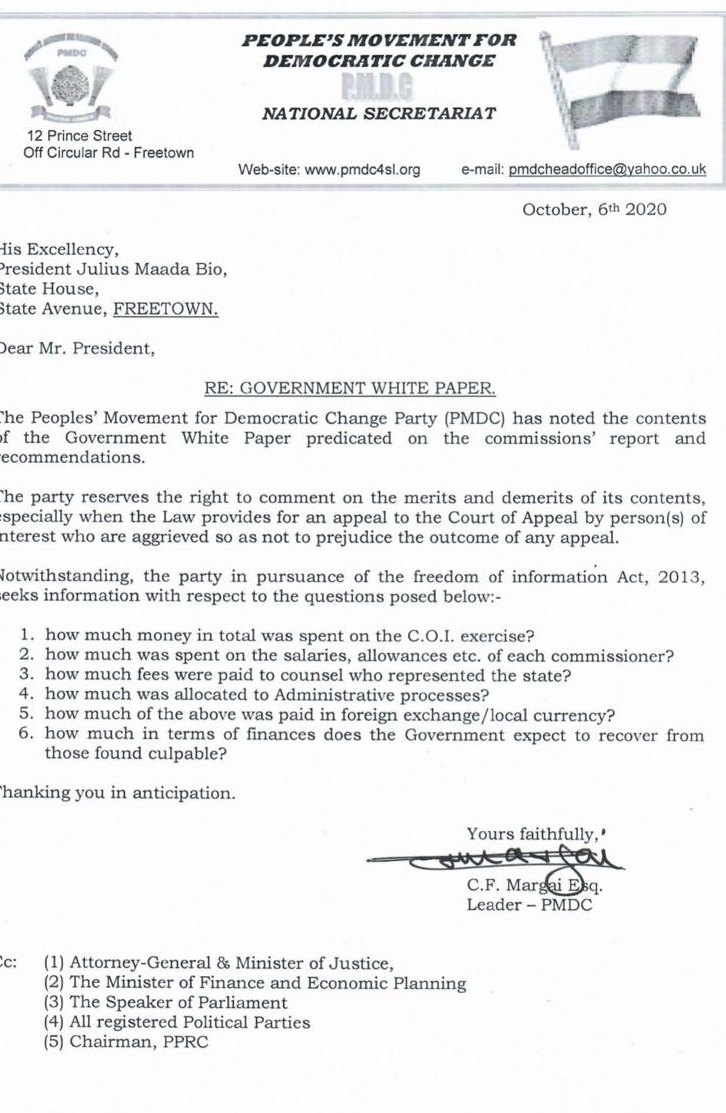 Charles Margai queries President Bio about cost of COI