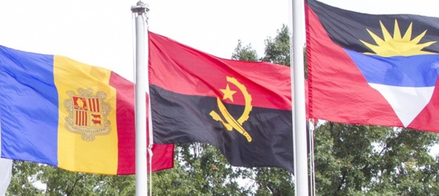 The flag of the Republic of Angola (centre) flying at United Nations Headquarters in New York
