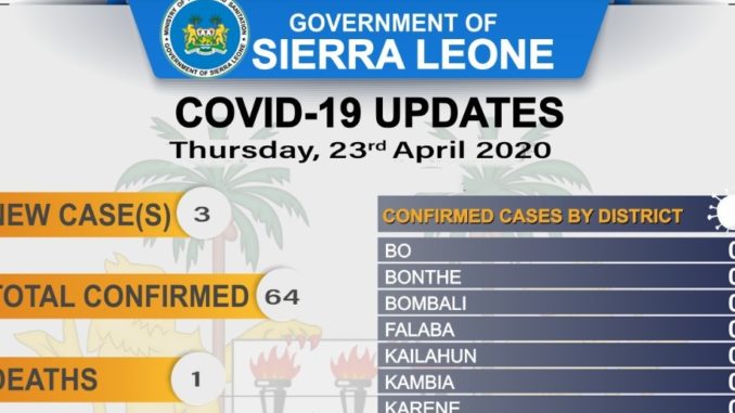 The total number of people confirmed as COVID-19 positive in Sierra Leone has increased to 64, after three cases were recorded in the last twenty-four hours, according to ministry of health officials.