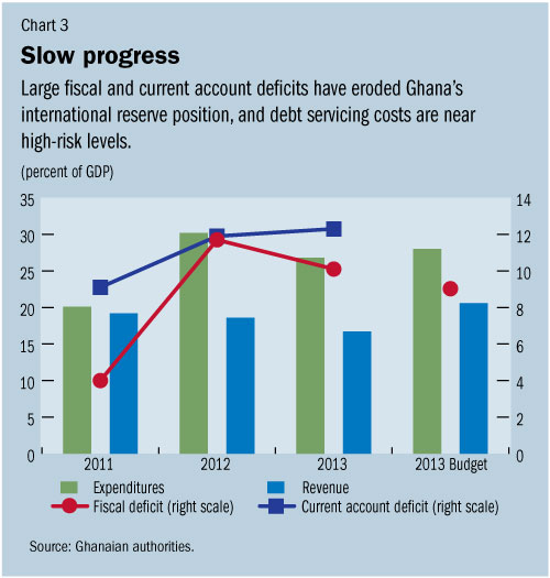 Having been the fastest-growing economy in sub-Saharan Africa in 2011, Ghana is heading for a third successive year of slower growth, as large current account and budget deficits expose the economy to risks.
