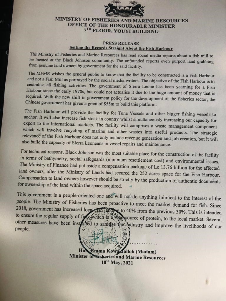 Government response to accusation of sale of land for fish meal production