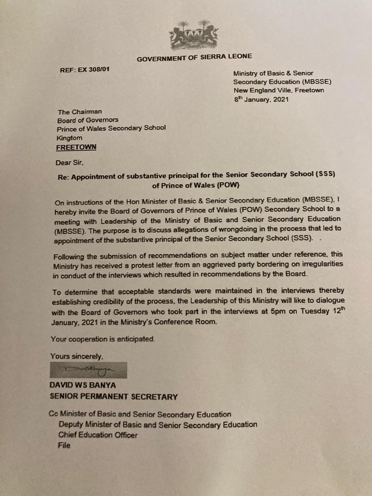 Education Permanent Secretary summons POW board to meeting