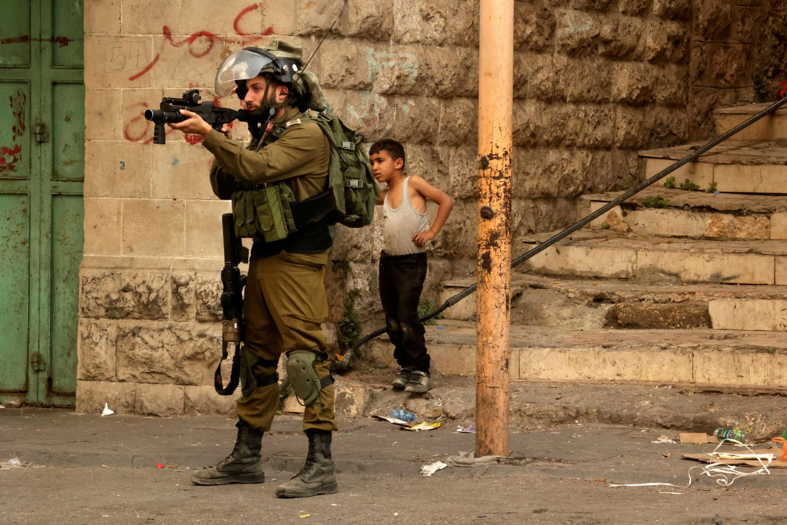 A Palestinian child stands behind a member of the Israeli security forces taking aim with a tear gas launcher, during confrontations with Palestinian protesters in the centre of the occupied-West Bank city of Hebron, on October 28,2022. (Photo by HAZEM BADER / AFP) (Photo by HAZEM BADER/AFP via Getty Images)