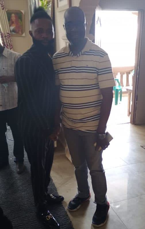 Minister of information Mohamed Rado Swaray and Attorney General Brewah posing with murderer LAC at the residence of Attorney General Brewah after LAC’s release from jail 1