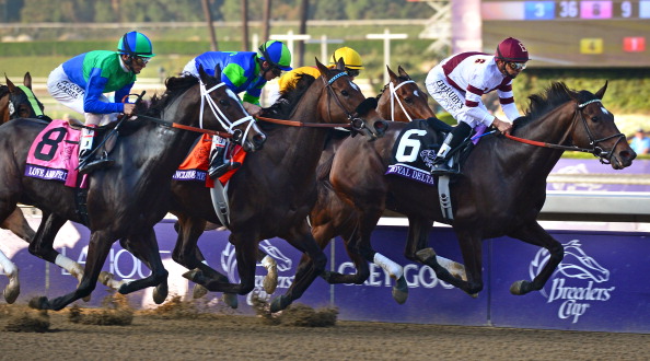 Jockey Mike Smith rides Royal Delta (R#6) to victory in the Breeder’s Cup Ladies’ Classic race at Santa Anita racetrack in Arcadia, California, on November 2, 2012 ahead of Include Me Out ridden by Joseph Talamo (C#7) and Love and Pride ridden by John Velasquez (L#8). AFP PHOTO / Frederic J. BROWN (Photo credit should read FREDERIC J. BROWN/AFP/Getty Images)