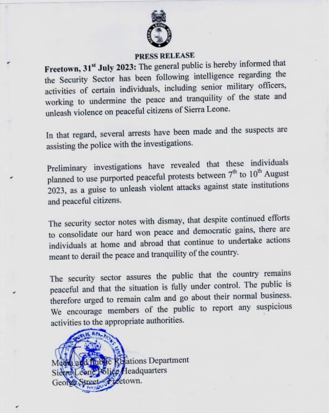 statement published yesterday by Sierra Leone police