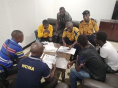 Local authority staff and emergency service workers in Freetown discuss the disaster management procedures